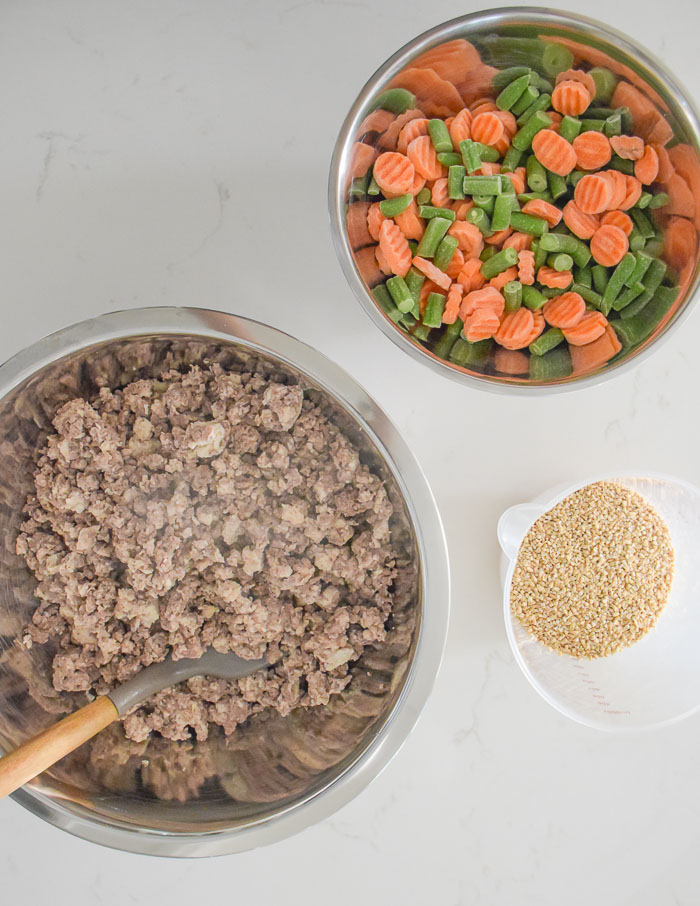 Umm, you mean food? To me, feeding your dog solely kibble is like eating dry, fortified cereal everyday. This isn’t a judgment. My dog is easy to feed at home because she is so small and doesn’t eat very much. If I had a 100lb dog, making their food everyday would be a lot of work! To me, feeding your dog meat and vegetables is the most natural thing you can do. I am not saying Mimi has never snuck off with a piece of pizza before or that I don’t let her nibble the occasional ice cream, but generally, I feed her vegetables and meat, with a little bit of oats, and she has done really, really well on this diet. I still let her have treats like Pup-Peronis and Greenies but her two meals of the day are this recipe!