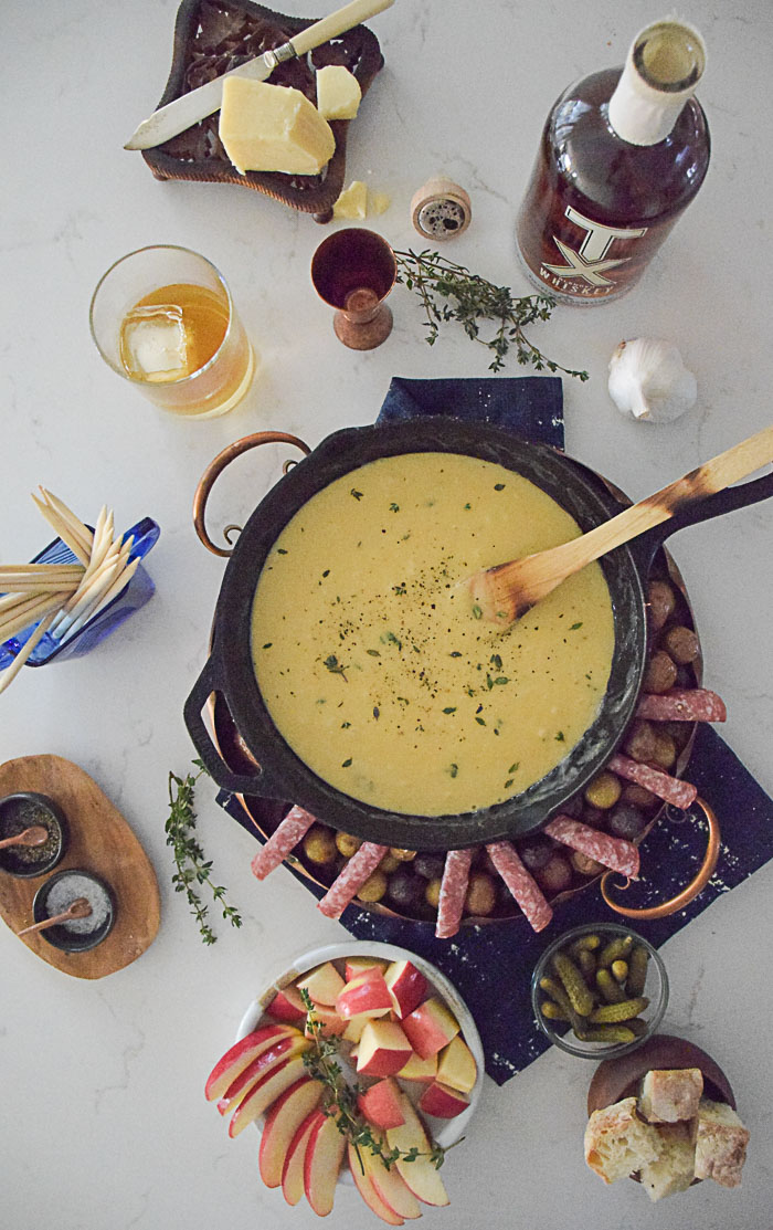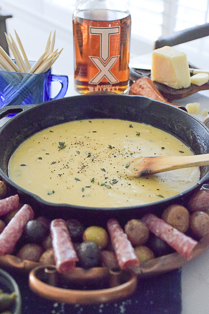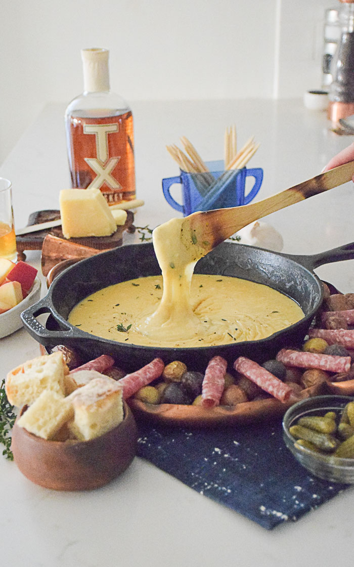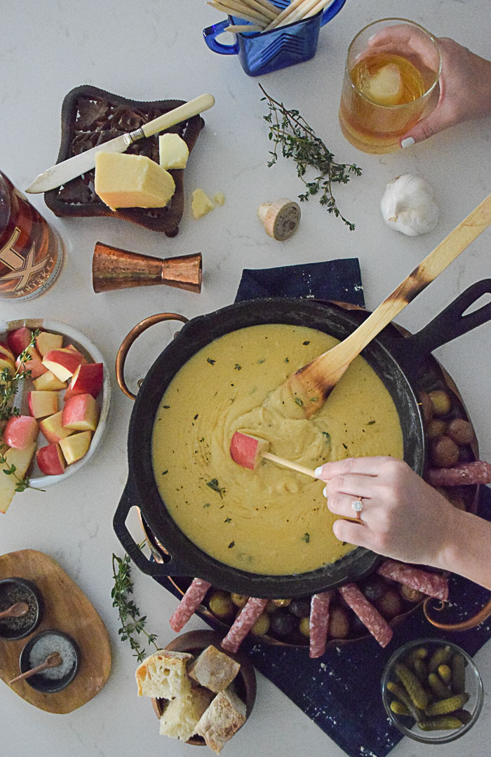 The holidays are upon us and I’ve been racking my brain to come up with new, festive recipes to serve at our upcoming parties. In Texas, we love our queso but I wanted to add in something a little different than queso or a cheese plate. That’s where this Whiskey Cheddar Fondue comes in! I must say, I was always scared of fondue because I thought it would be difficult to make or serve and I honestly could not have been more wrong. This came together so easily and was delicious and of course fun!